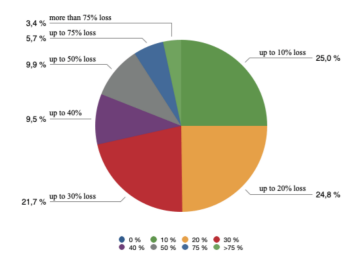 Modrý graf znázorňuje odpovědi 358 respondentů rakouské studie na otázku: „O kolik klesl od vypuknutí pandemie covid-19 váš letošní obrat?“ Vyplývá z něj, že asi čtvrtina respondentů utrpěla ztrátu až 30 % a další zhruba čtvrtina uvádí propad až o 20 %. Pokles obratu o 75 % aktuálně postihuje jednu desetinu dotazovaných.