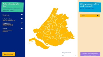 Prostřednictvím výběrů v pravém sloupci můžete například zjistit, zda je kulturní nabídka dané organizace vhodná pro hlavní cílové skupiny v obci. Nebo lze zjistit, zda již nějaké projekty v obcích Jižního Holandska začaly využívat dotační program.