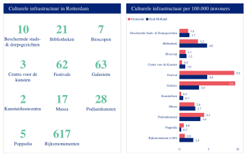 Vlevo je zobrazen počet kulturních organizací v Rotterdamu. Graf vpravo ukazuje počet kulturních institucí na 100 000 obyvatel. Červená barva označuje obyvatele Rotterdamu a tmavě modrá barva obyvatele Jižního Holandska.