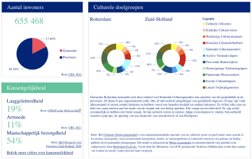 Kulturní mapa obsahuje údaje o obyvatelích dané oblasti (v tomto případě se jedná o Rotterdam). Vlevo nahoře je počet obyvatel, pod tímto grafem je procentuálně vyjádřena rovnost příležitostí a vpravo jsou grafy kulturních cílových skupin.