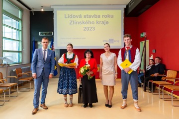 Vlevo hejtman Zlínského kraje Radim Holiš a jako druhá zprava Zuzana Fišerová na předávání ocenění Lidová stavba roku Zlínského kraje 2023, které získal venkovský dům čp. 174 v Tupesích. Foto z archivu odboru kultury.